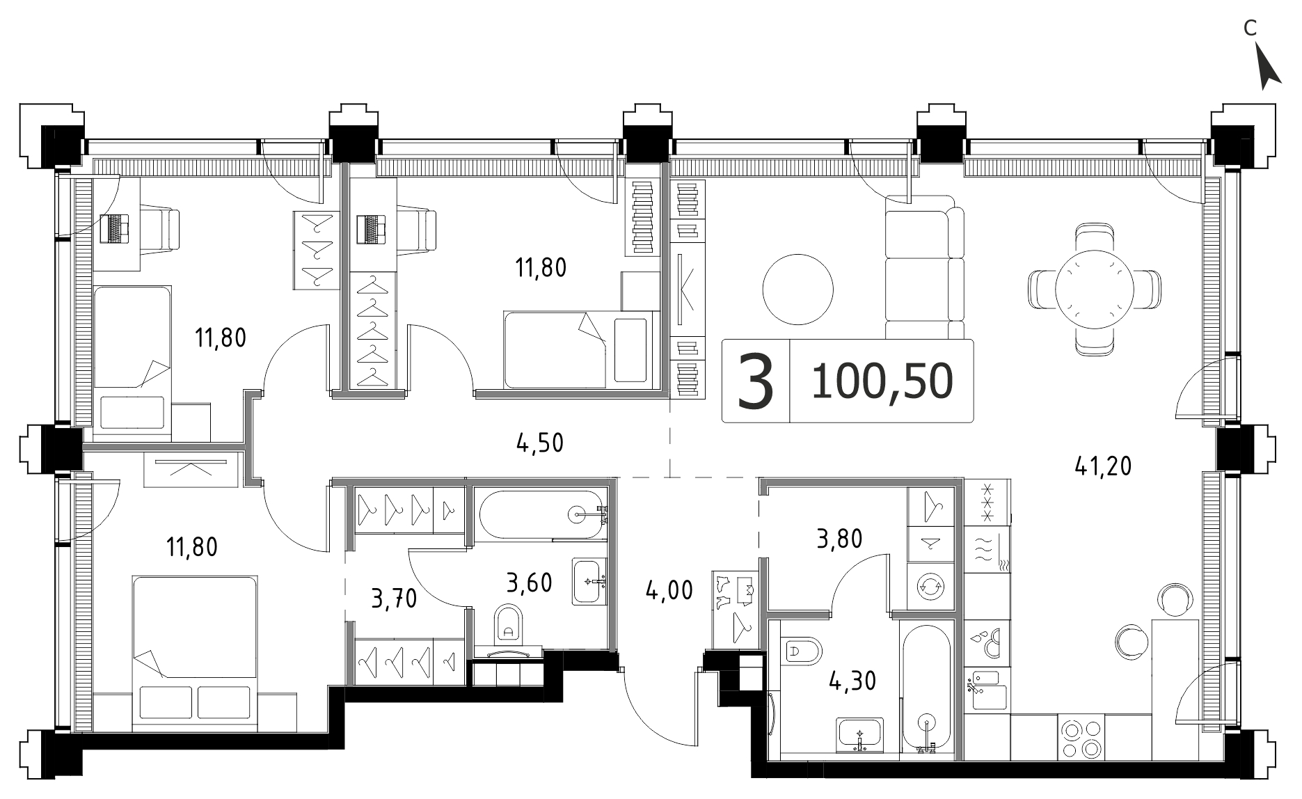 Четырехкомнатная квартира 103.93 м², 4 этаж, ЖК «СЕТ» (SET)