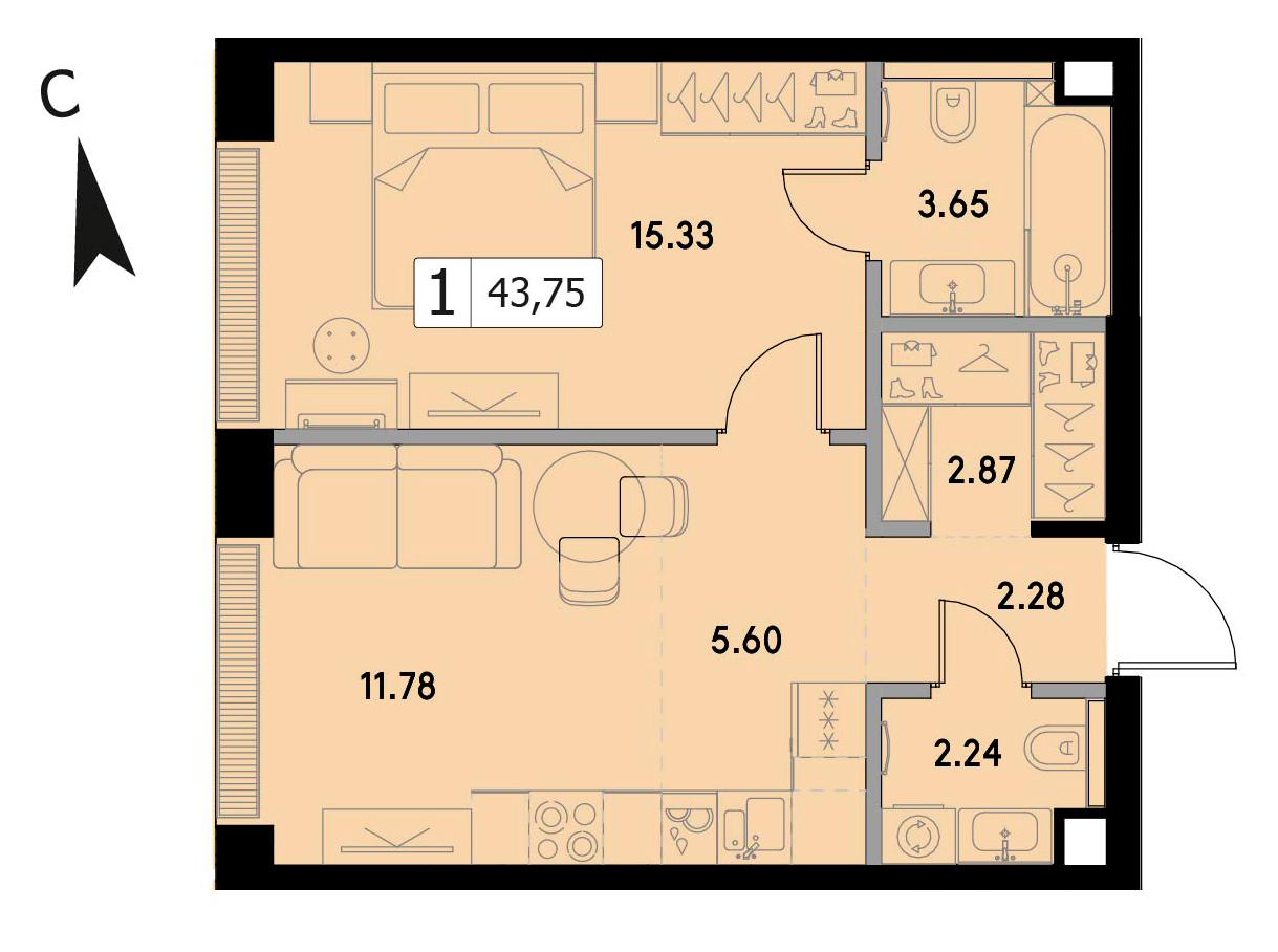 Двухкомнатная квартира 47.8 м², 28 этаж, ЖК «ВЕЕР» (VEER)
