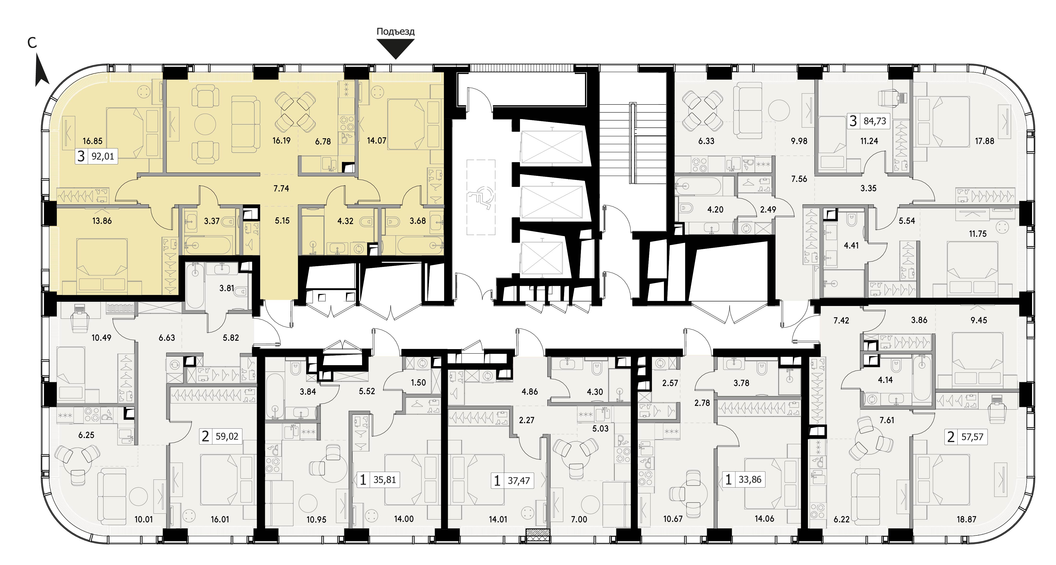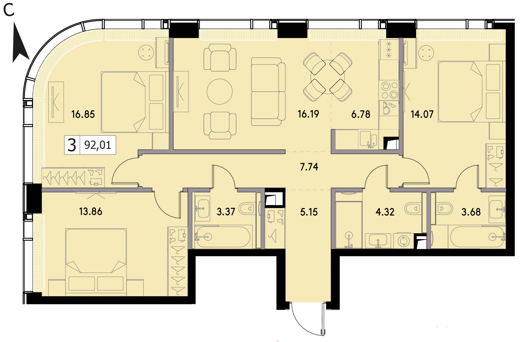 Трехкомнатная квартира 92.01 м², 14 этаж, ЖК «ВЕЕР» (VEER)