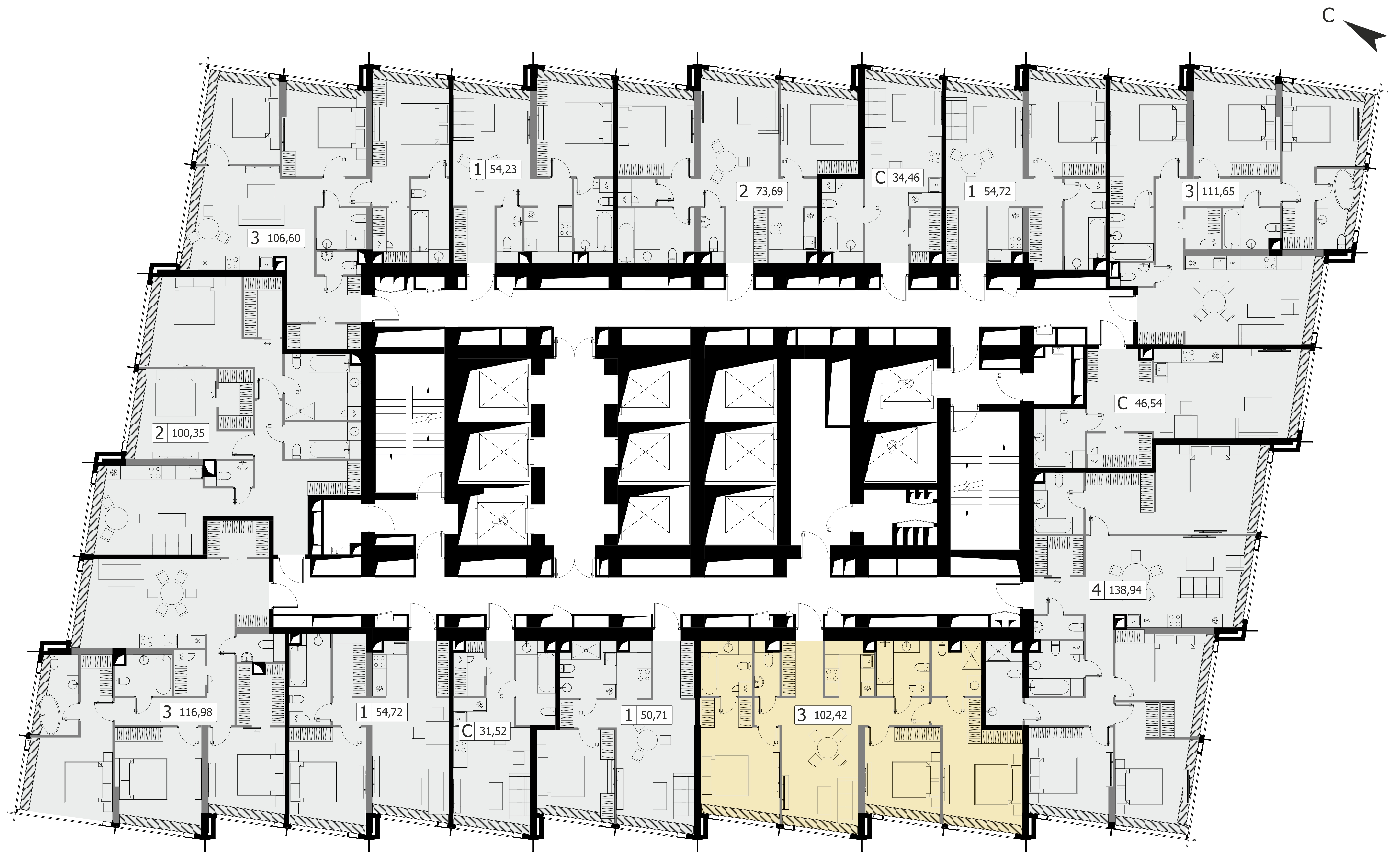 Комфортная трехкомнатная квартира квартира площадью 102.42 м² без отделки. Лот расположен на 6 этаже, корпуса 1 МФК «Дом Дау».Комплекс находится по адресу: г. Москва, Пресненская наб., вл. 14/15, срок сдачи 2027г.. Это соединение удобной инфраструктуры городской застройки и зеленых зон отдыха.