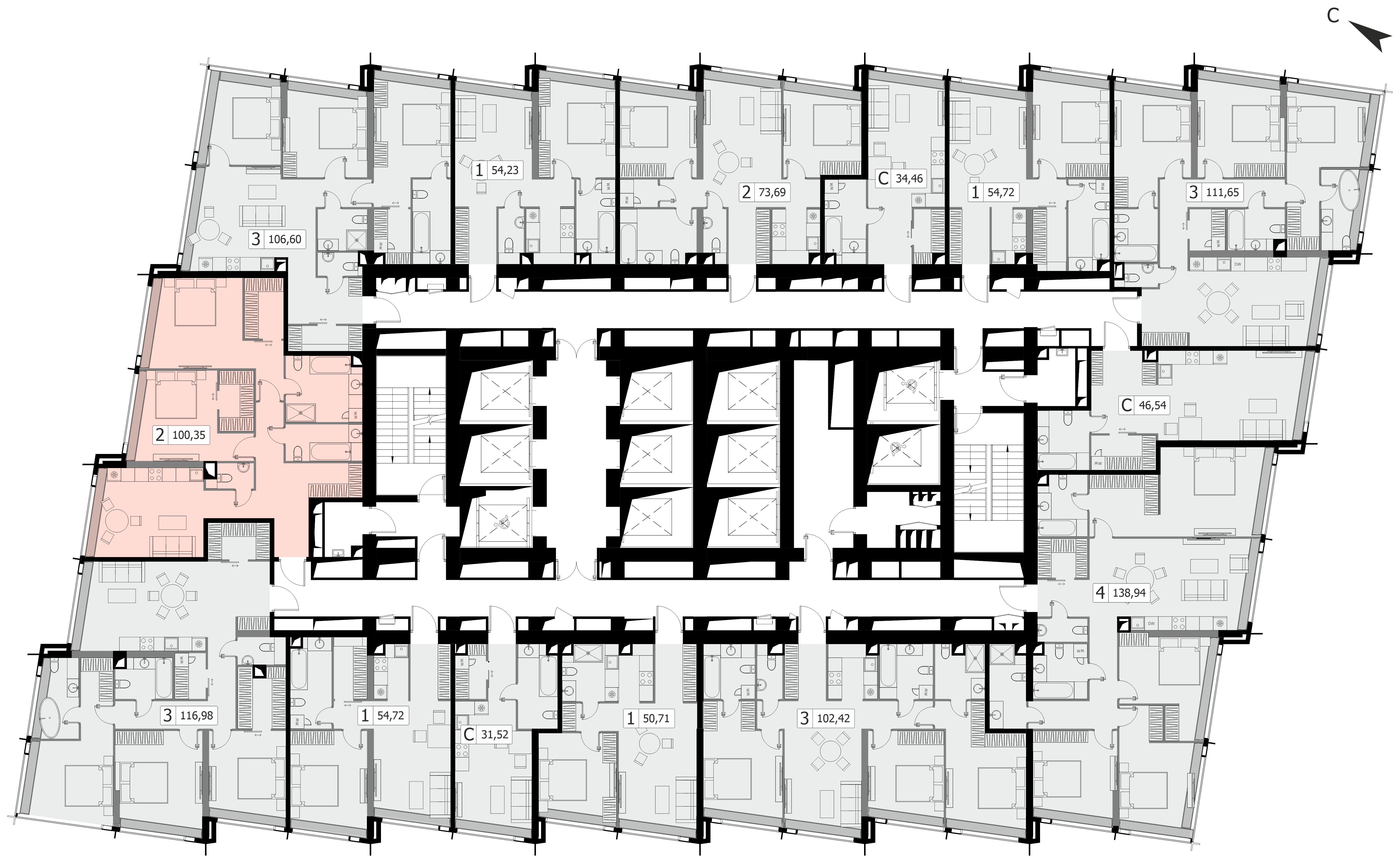 Комфортная двухкомнатная квартира квартира площадью 100.36 м² без отделки. Лот расположен на 6 этаже, корпуса 1 МФК «Дом Дау».Комплекс находится по адресу: г. Москва, Пресненская наб., вл. 14/15, срок сдачи 2027г.. Это соединение удобной инфраструктуры городской застройки и зеленых зон отдыха.