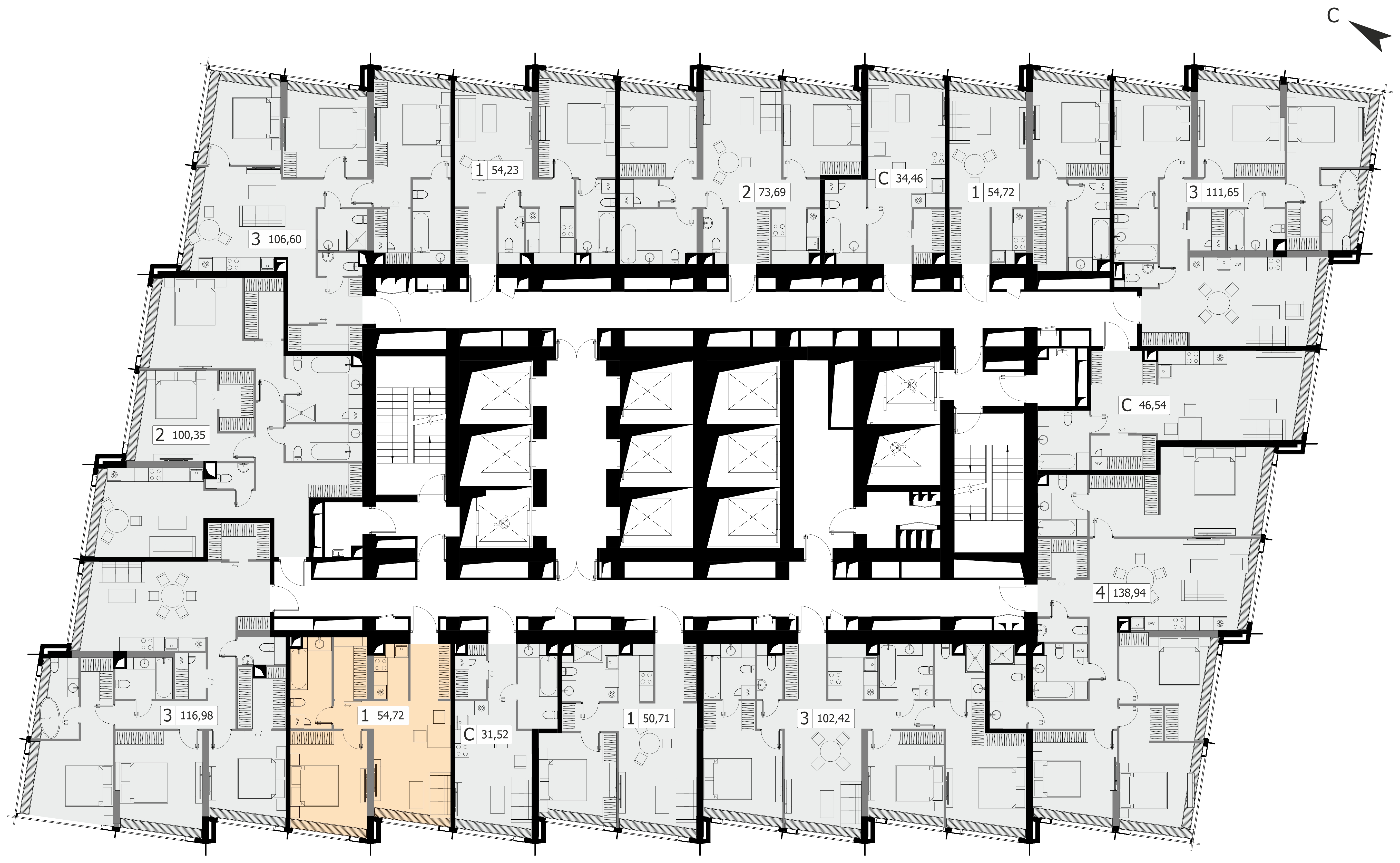 Комфортная однокомнатная квартира квартира площадью 53.09 м² без отделки. Лот расположен на 13 этаже, корпуса 1 МФК «Дом Дау».Комплекс находится по адресу: г. Москва, Пресненская наб., вл. 14/15, срок сдачи 2027г.. Это соединение удобной инфраструктуры городской застройки и зеленых зон отдыха.