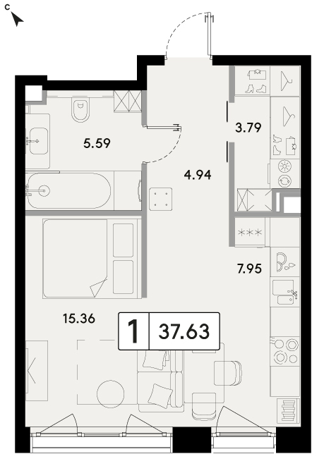 Однокомнатная квартира 42.3 м², 2 этаж, ЖК «МЫС»