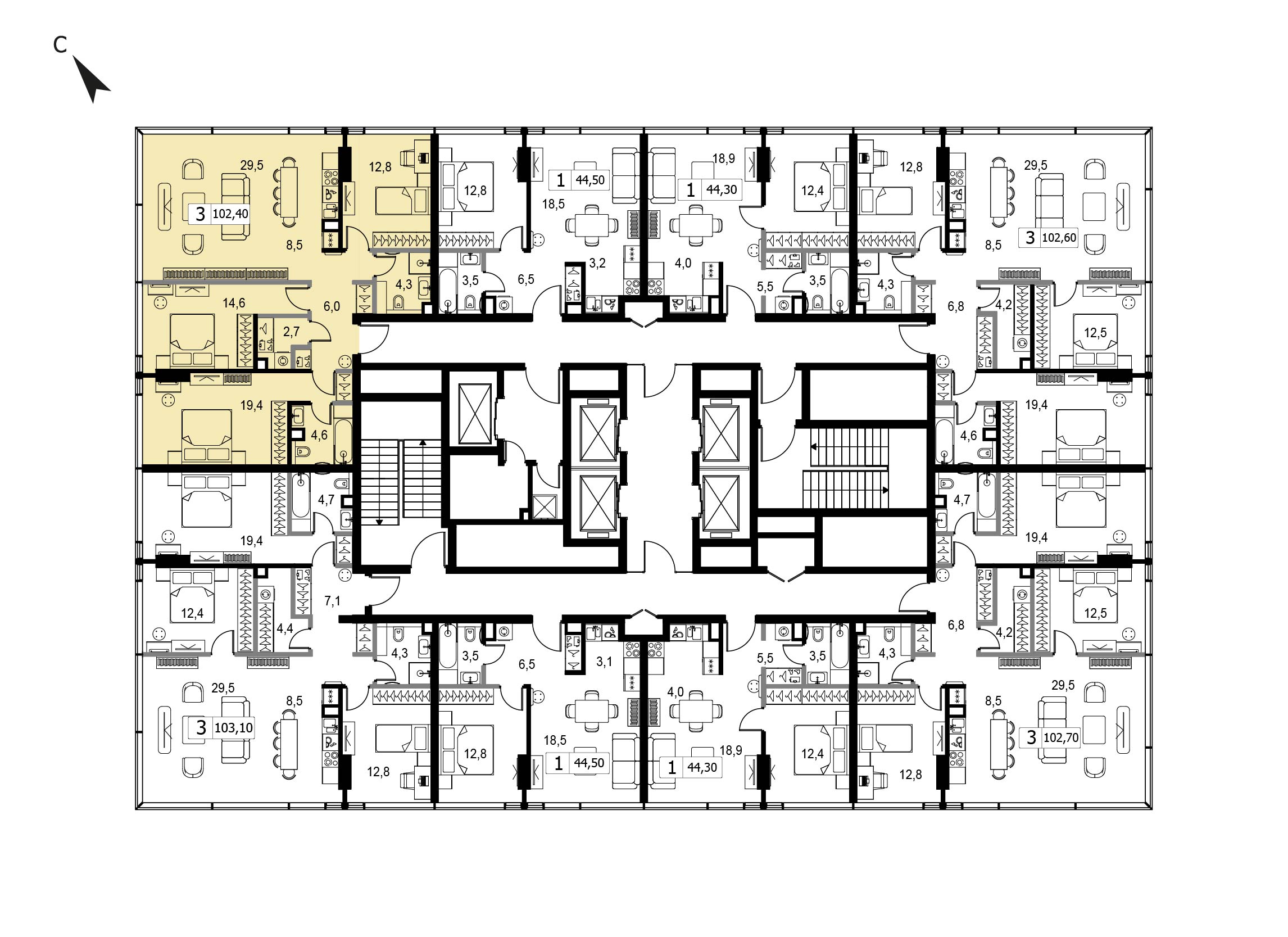 Комфортная трехкомнатная квартира квартира площадью 102.7 м² без отделки. Лот расположен на 29 этаже, корпуса E МФК «СЛАВА» (SLAVA).Комплекс находится по адресу: г. Москва, Ленинградский пр., вл. 8, срок сдачи 2027г.. Это соединение удобной инфраструктуры городской застройки и зеленых зон отдыха.
