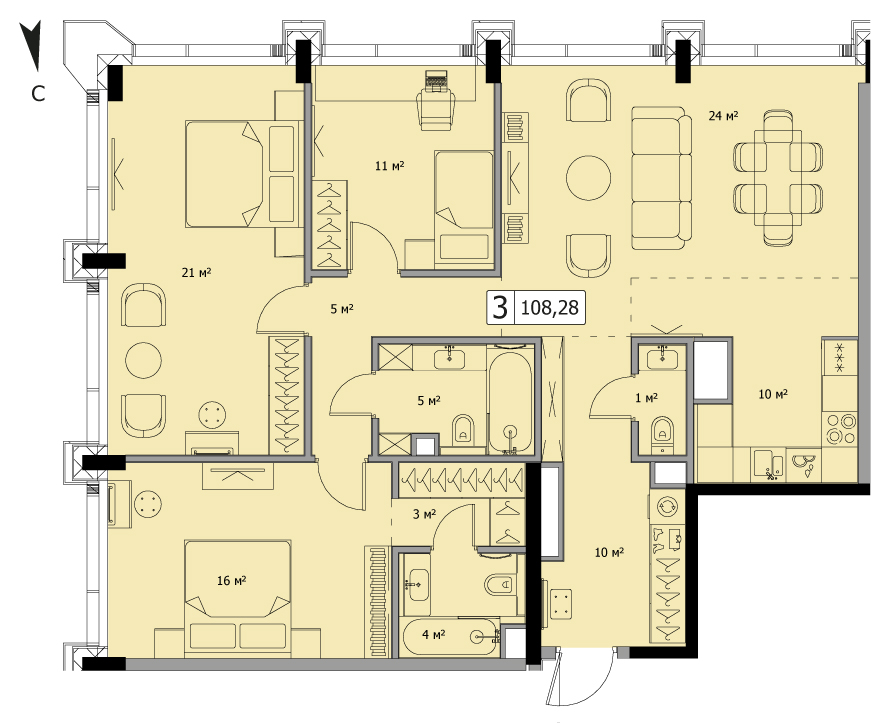 Трехкомнатная квартира 105.04 м², 6 этаж, ЖК «МОД» (MOD)
