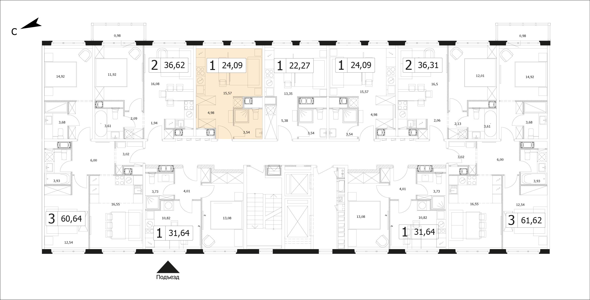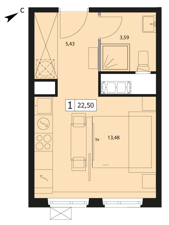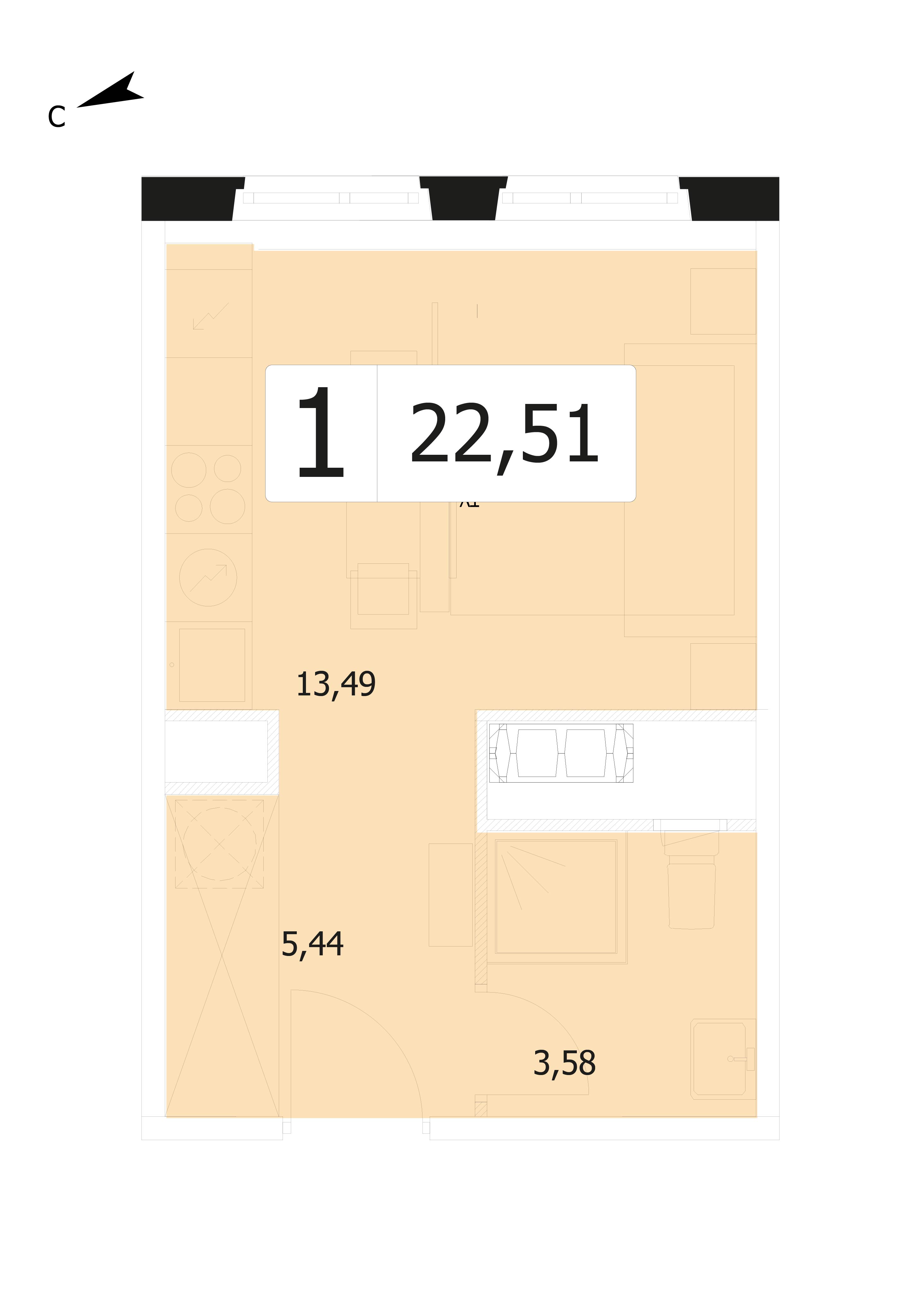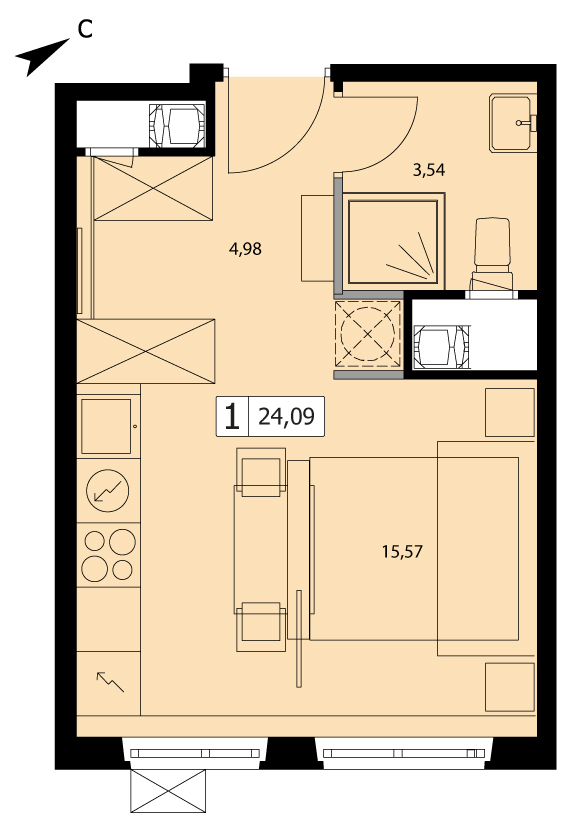Комфортная студия квартира площадью 24.1 м² с отделкой .