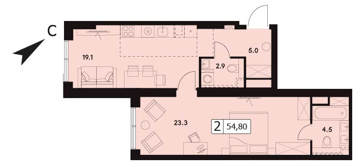 Однокомнатная квартира 54.8м², 9 этаж