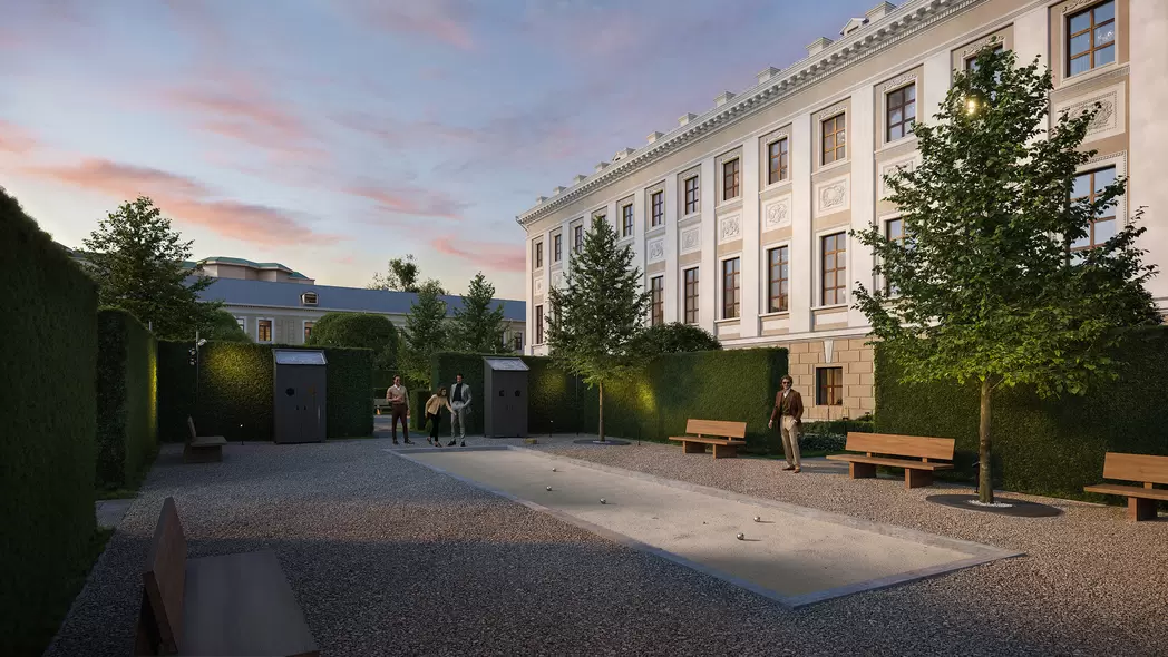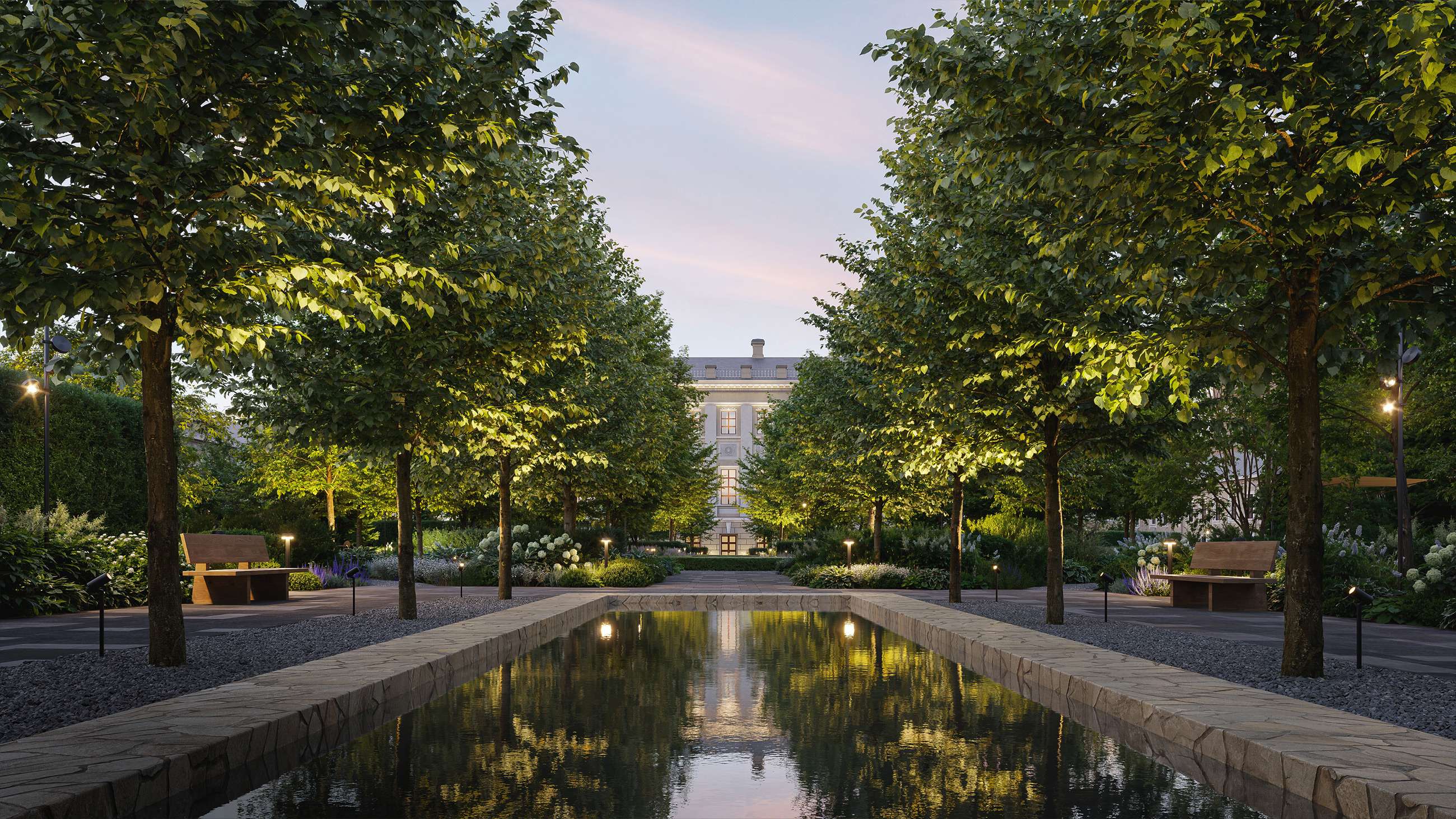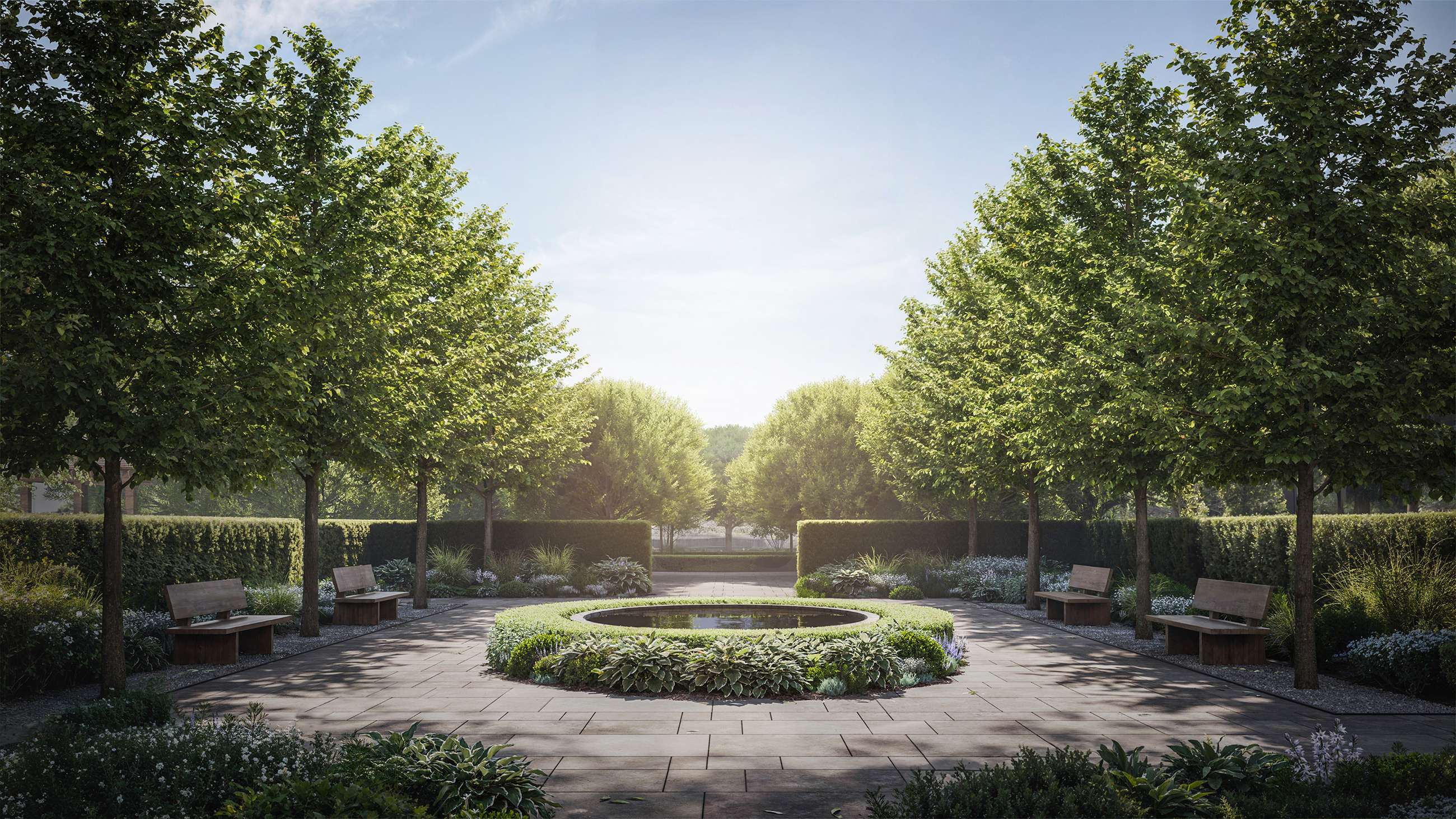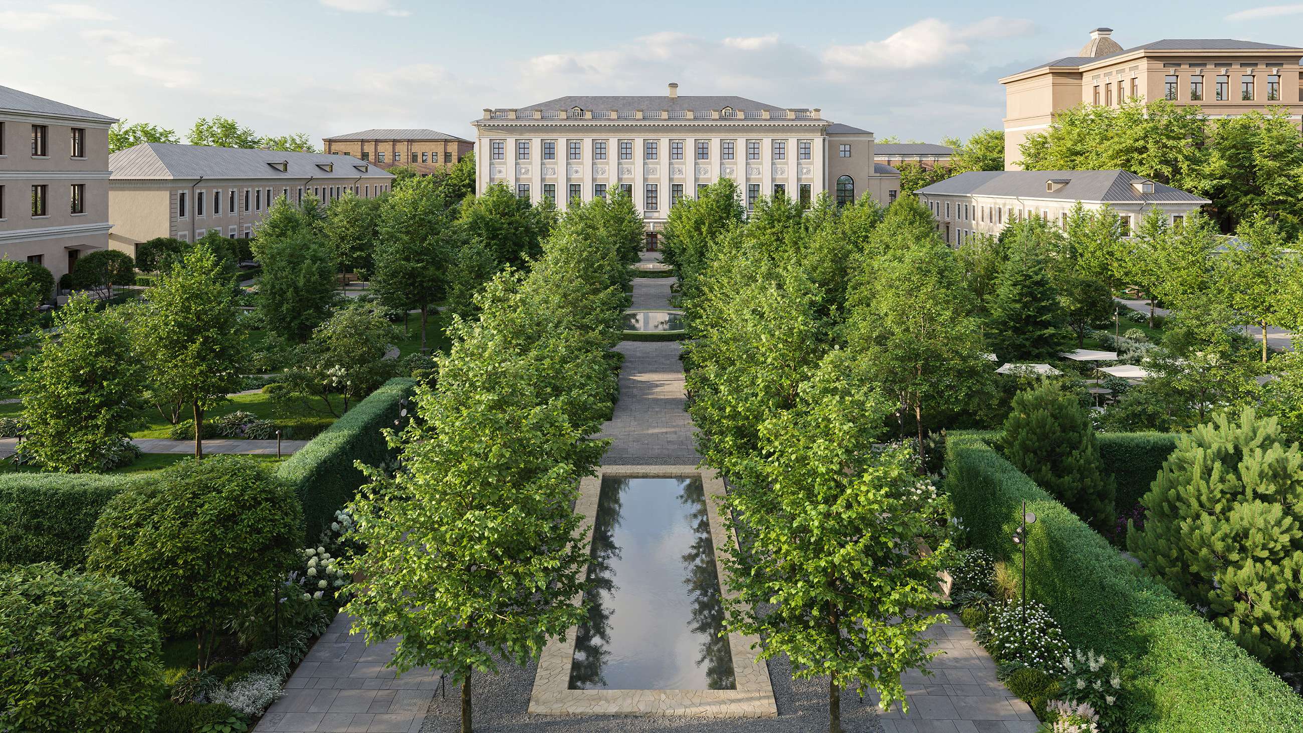 Здесь — тенистые аллеи, уединённые беседки, зеркальные пруды и садовая роща, создающая мягкий полутень. Центральный водоём становится смысловым центром композиции, а аллейная перспектива визуально объединяет пространство.