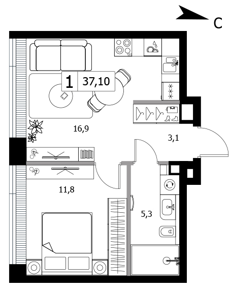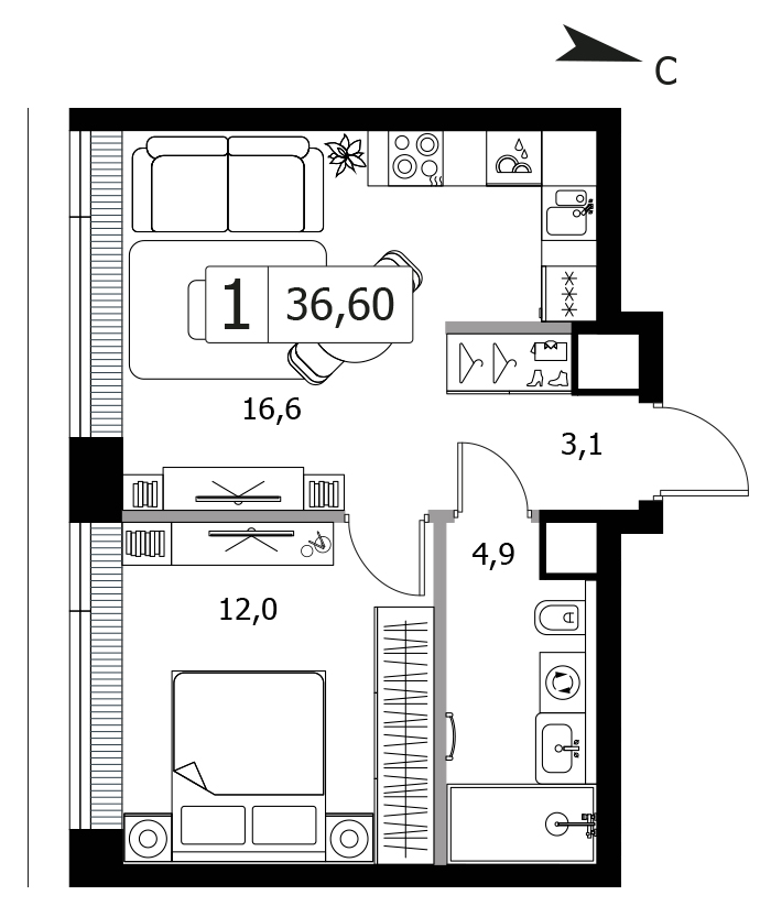 В продаже 1-комнатная квартира без отделки у метро Тушинская на 9 этаже, Корпус 1.