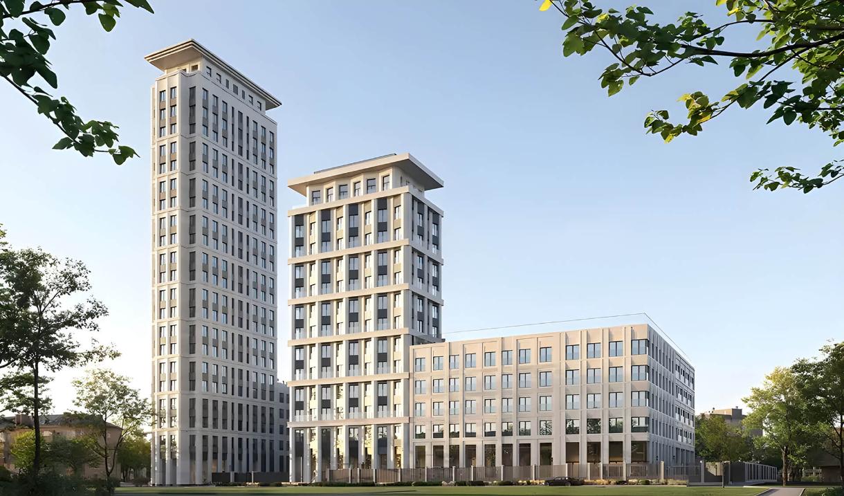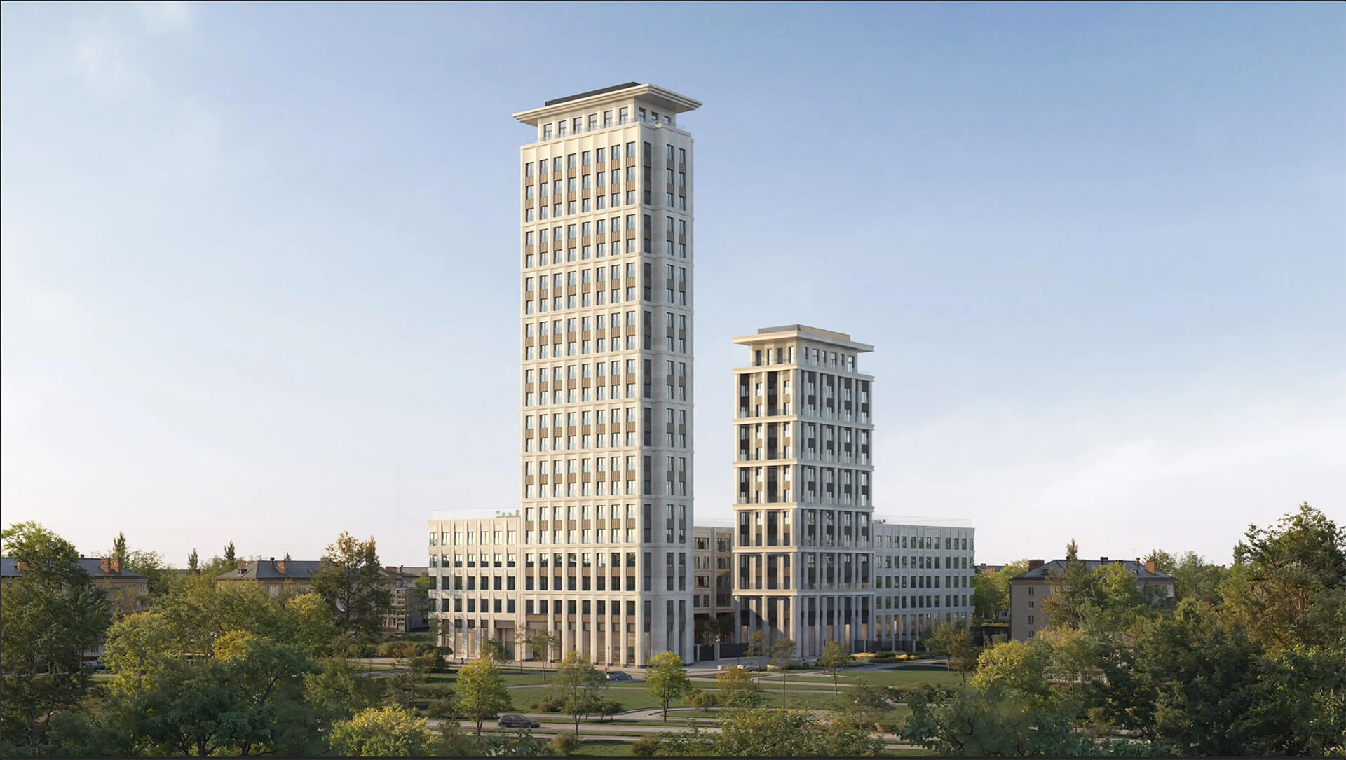 Архитектурный ансамбль, разработанный бюро СПИЧ, выполнен в сдержанной неоклассической стилистике. Семь секций и две доминанты формируют цельный, респектабельный образ с выразительными фасадами и продуманной пластикой.
