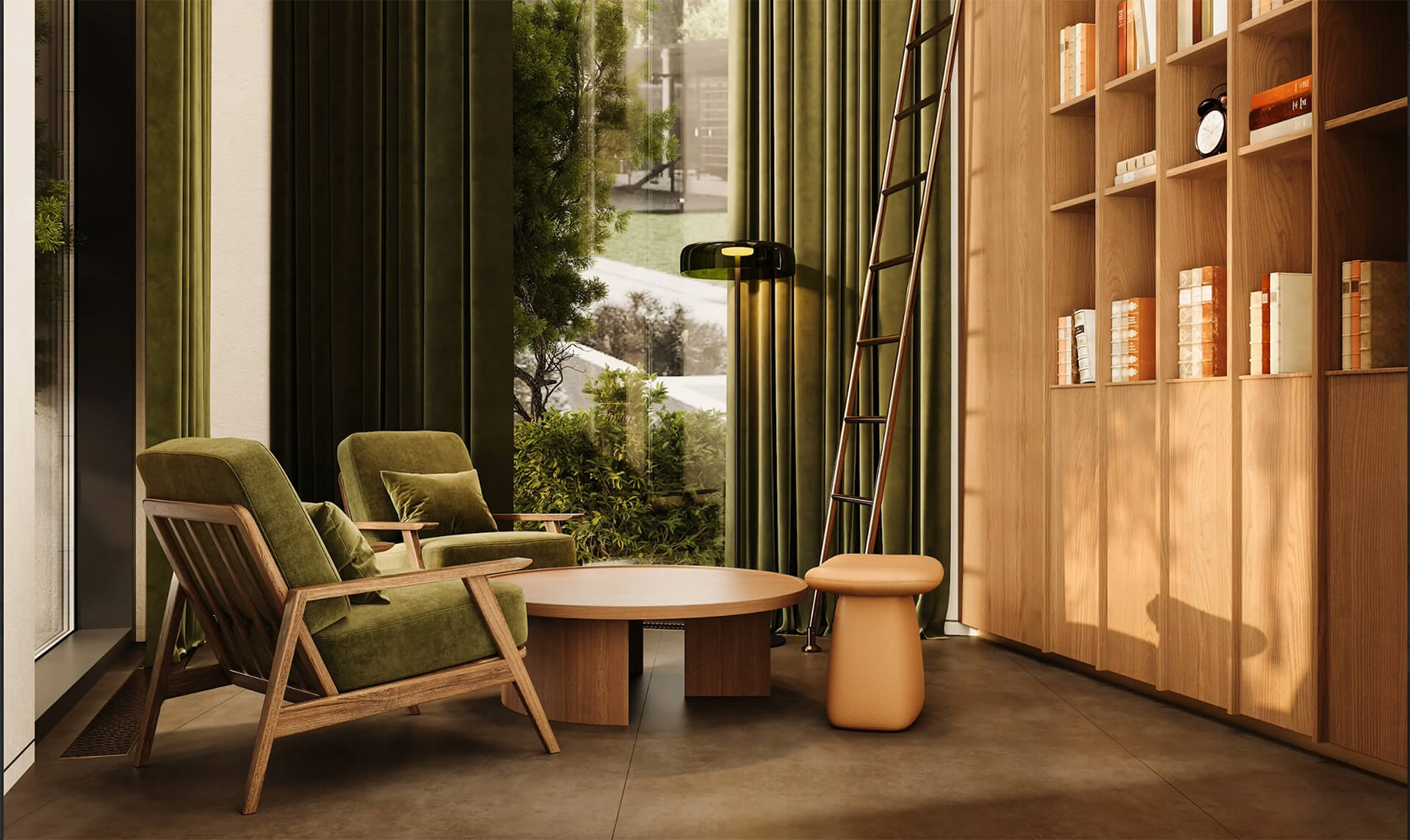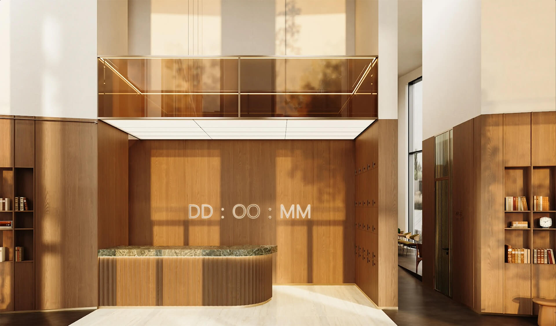 Гранд-лобби с высотой потолков более 5 метров оформлено в духе камерной библиотеки: тёплые материалы, мягкий свет, зоны для встреч и консьерж-сервис 24/7. Это не просто входная группа, а пространство для общения и спокойного пребывания.
