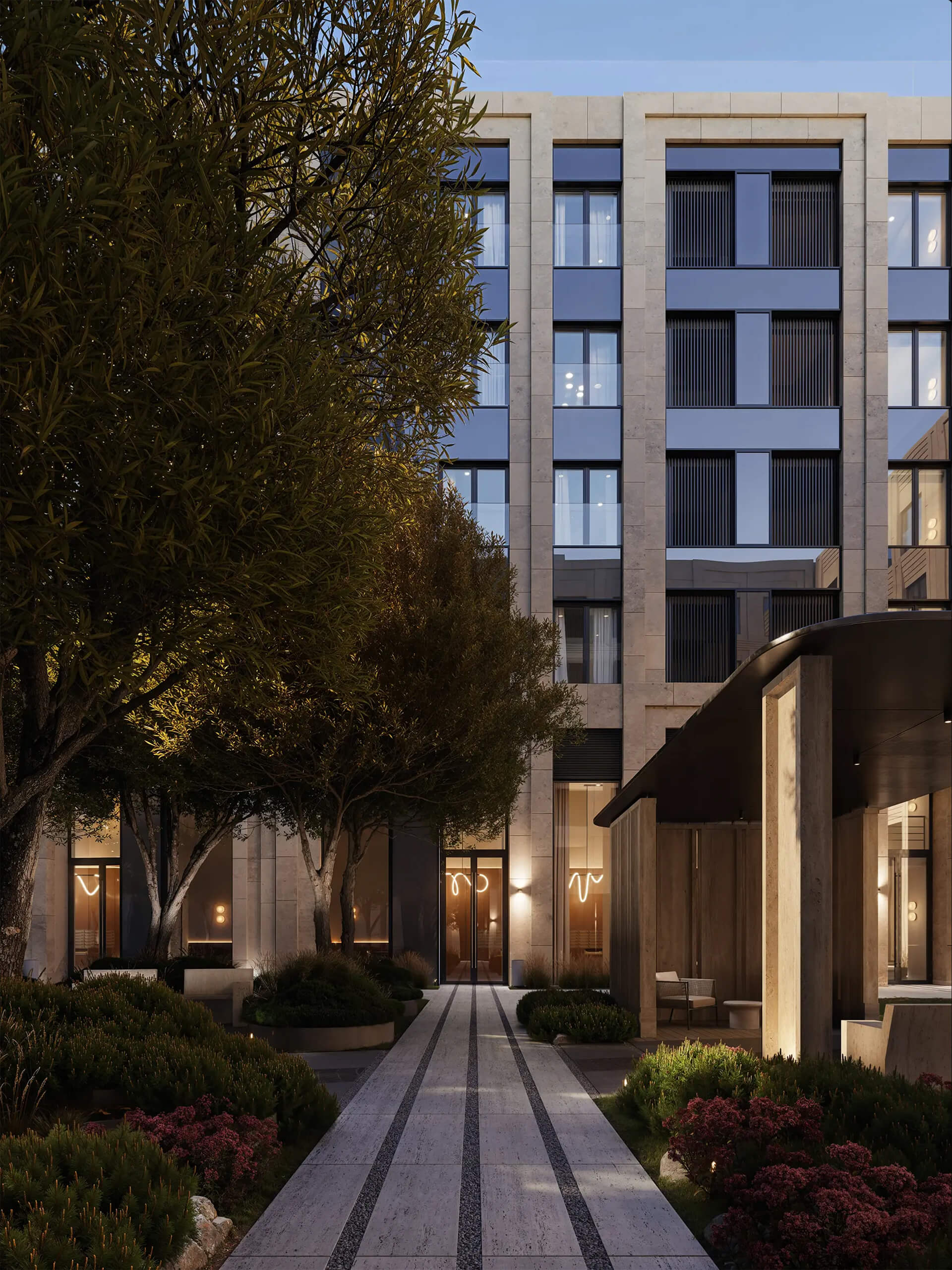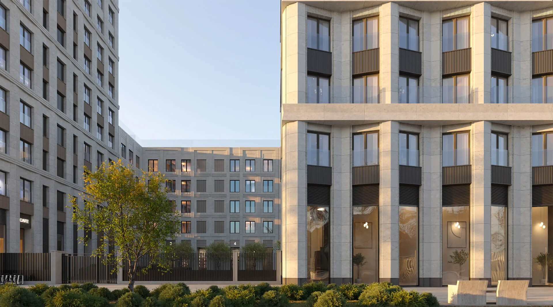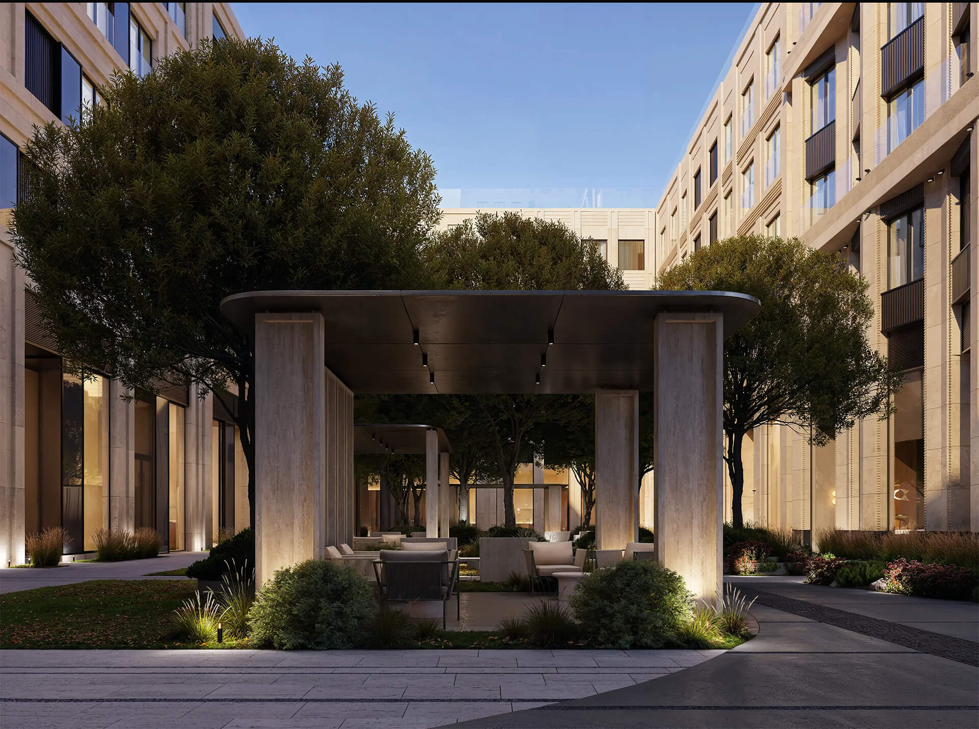Внутренний двор закрыт от внешнего города и организован как приватный сад. Зелёные маршруты, тихие зоны отдыха, детские и спортивные пространства распределены так, чтобы сохранять тишину и комфорт для всех жителей.