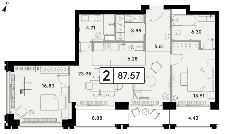 Двухкомнатная квартира 88.08м², 2 этаж