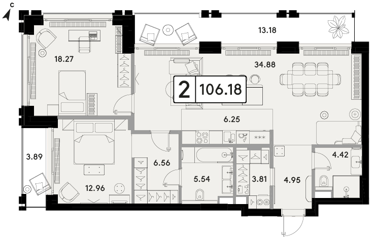 Двухкомнатная квартира 106.67м², 4 этаж