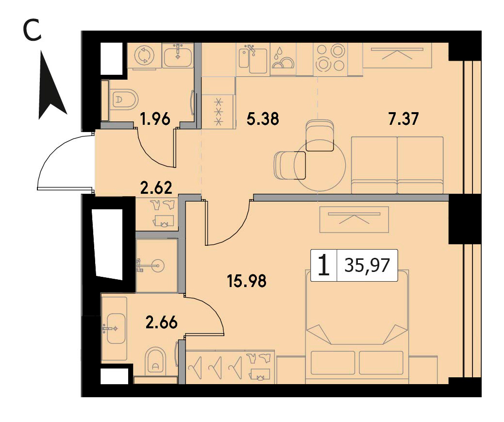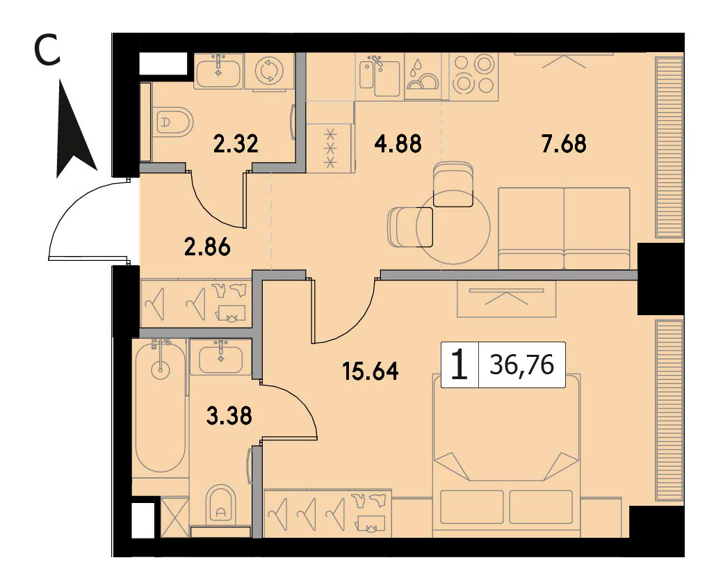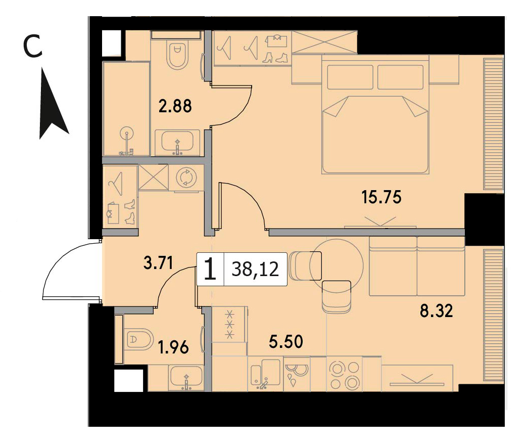 В продаже 1-комнатная квартира без отделки на 38 этаже, Корпус 1.3.
