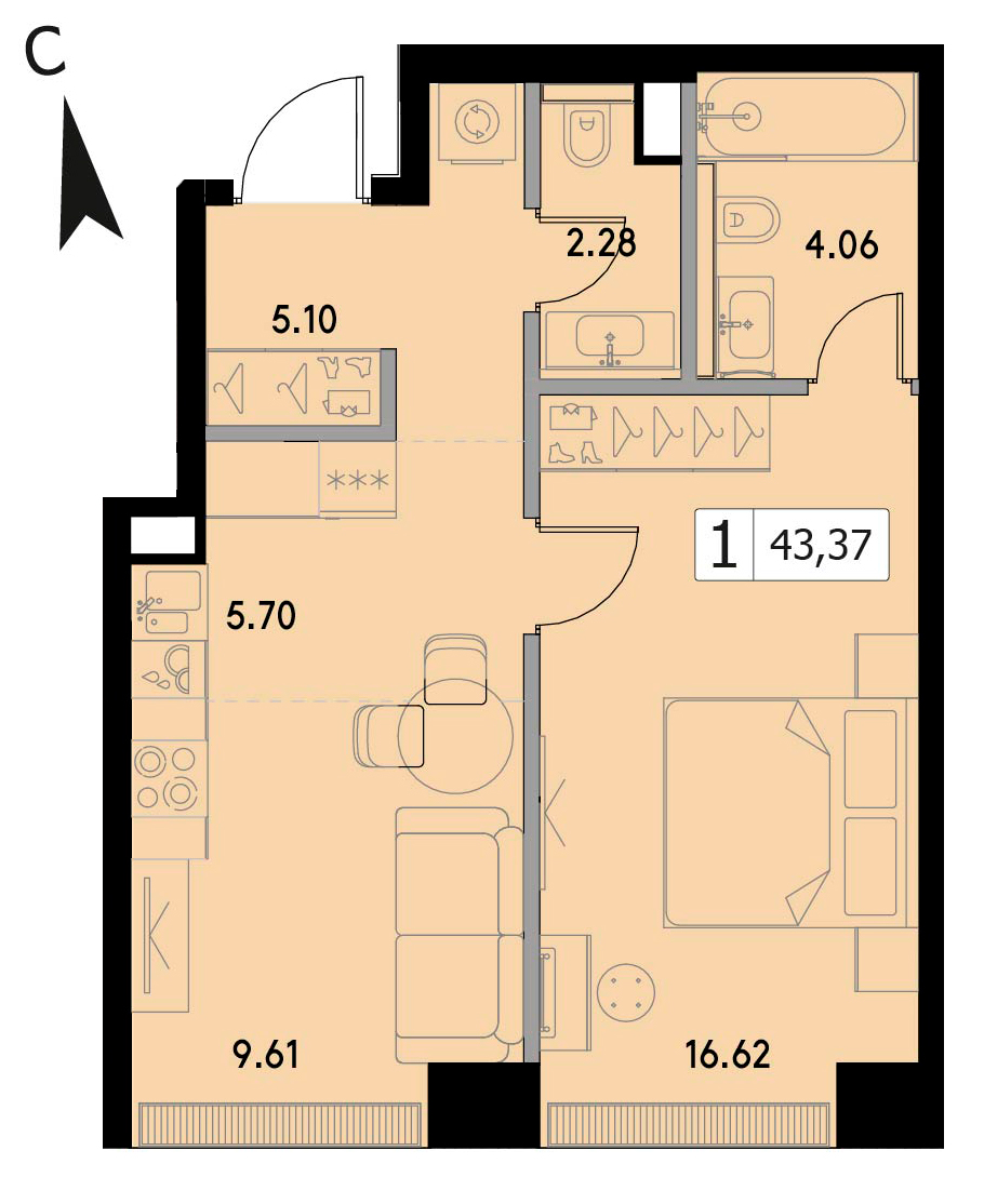 В продаже 1-комнатная квартира без отделки на 9 этаже, Корпус 1.3.