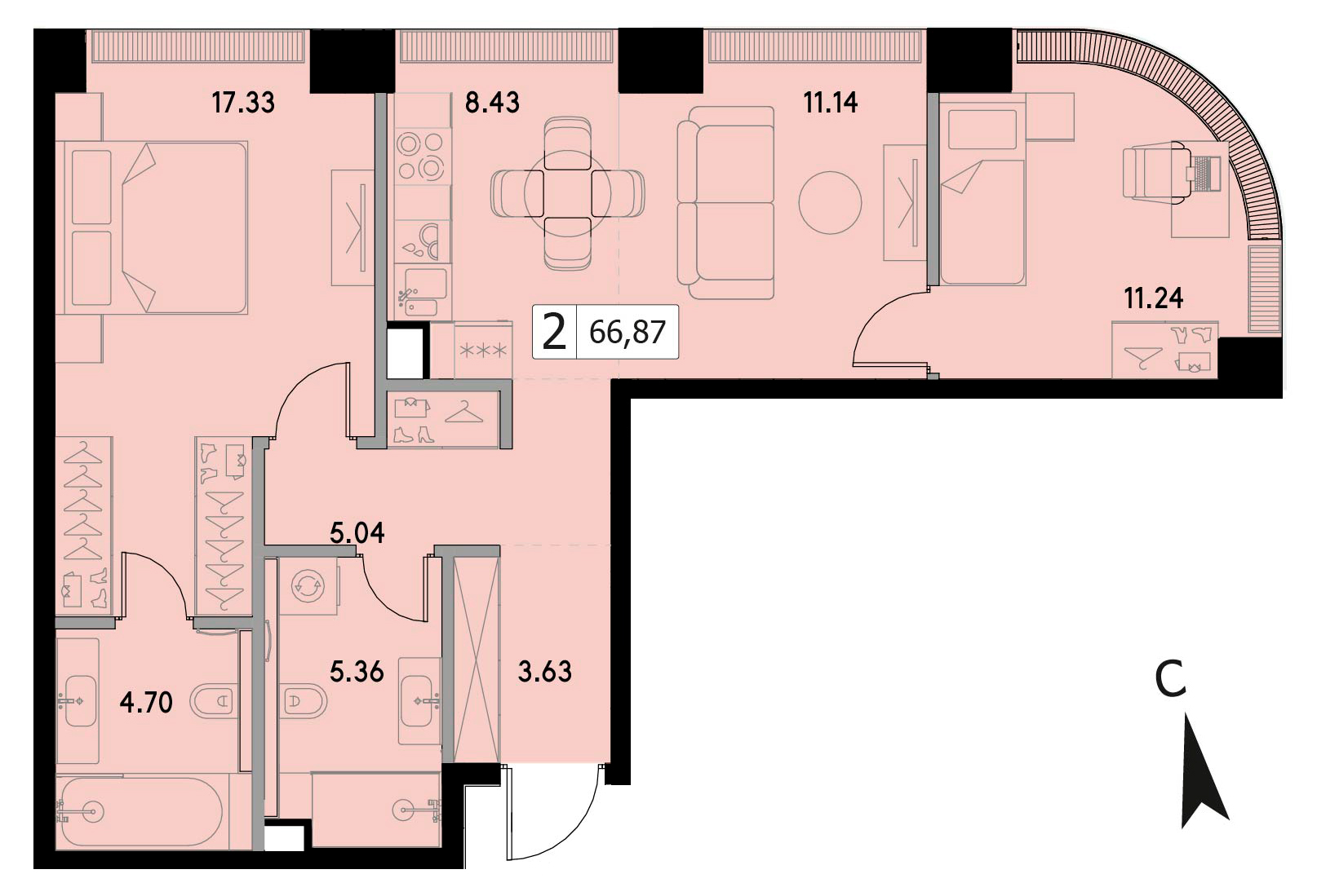 В продаже 2-комнатная квартира без отделки на 17 этаже, Корпус 1.3.