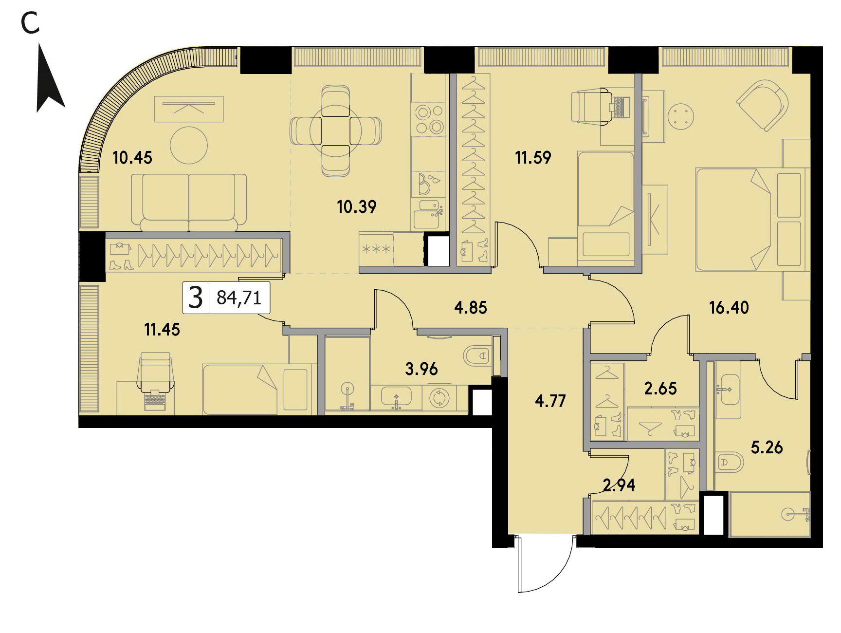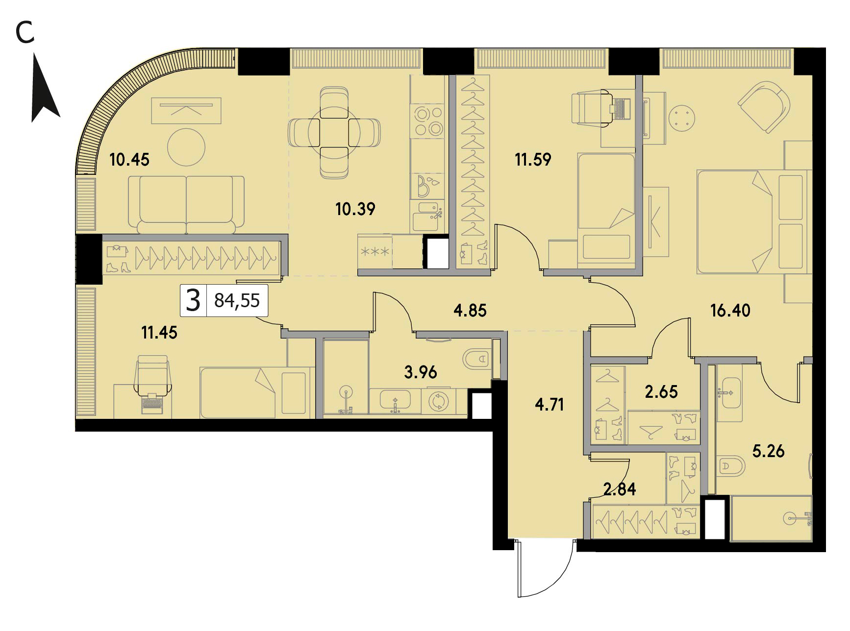 Представляем вашему вниманию 3-комнатная квартира без отделки на 26 этаже, Корпус 1.3.