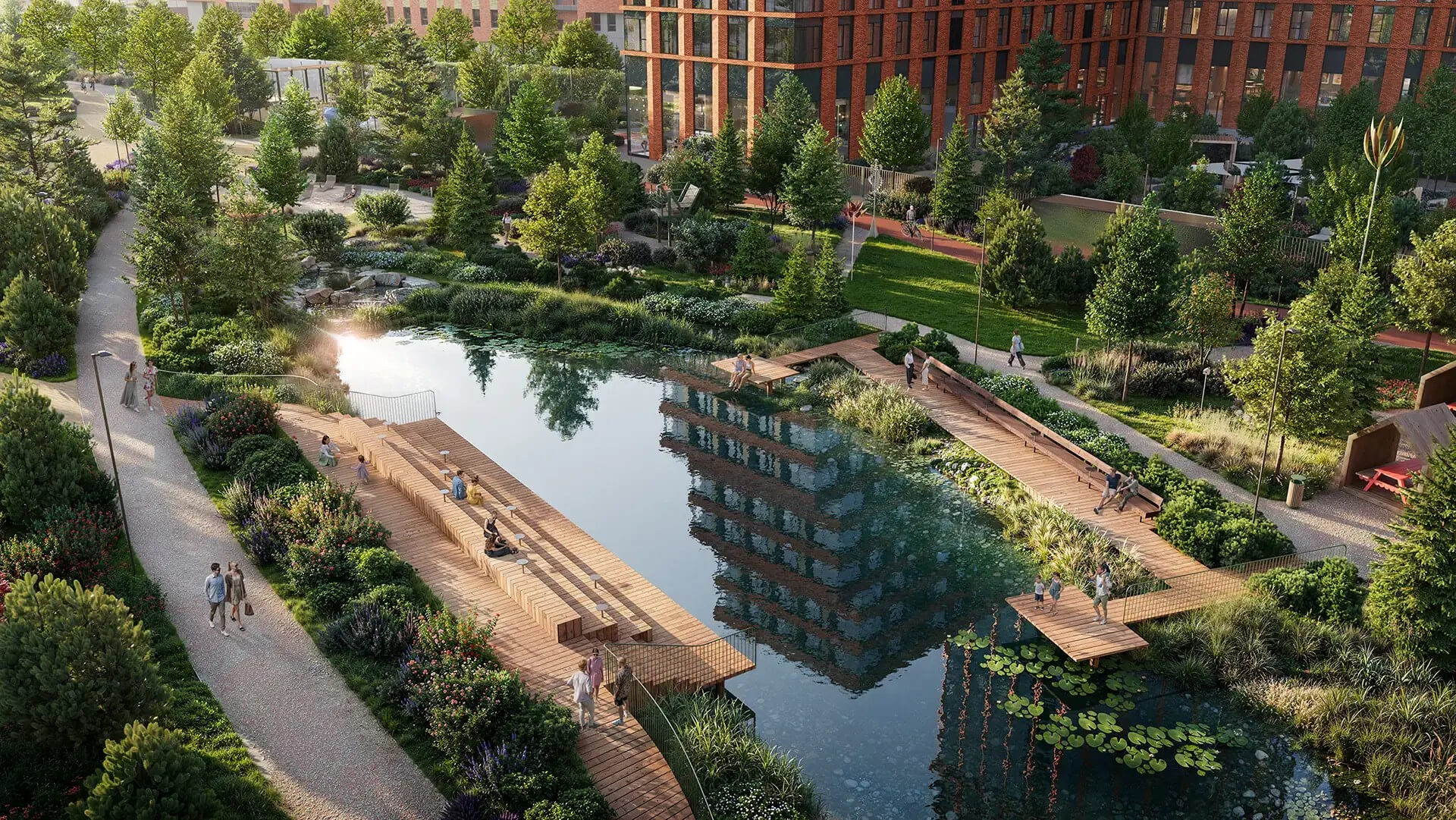 Инфраструктура квартала выстроена вокруг внутреннего парка площадью более 3 гектаров. Это зелёное пространство с аллеями, зонами отдыха и водоёмом становится центральным элементом жизни проекта.