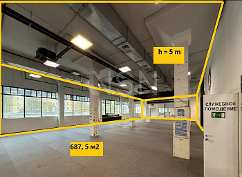 1 этаж: 241,1 м², высота потолков 3м, антресоль: 250,1 м², высота потолков 2,6 м.